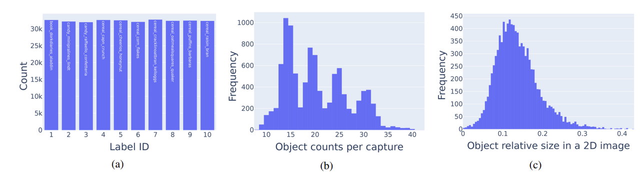 - Grocery (foreground) objects: A randomly selected subset of the 63 grocery objects is instantiated and randomly positioned in front of the camera per frame